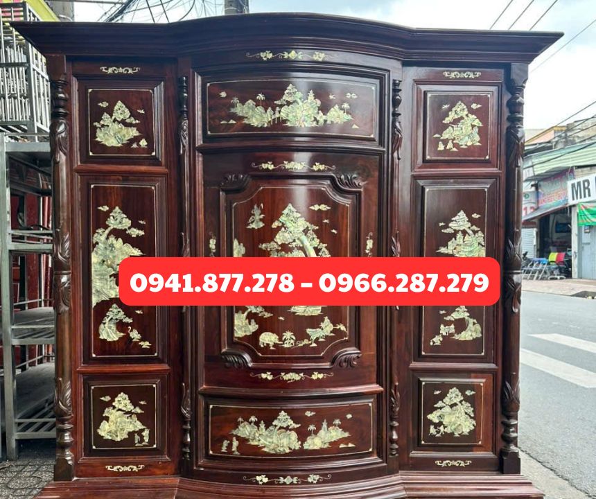 - Tủ khảm trai, chạm khắc hoa văn phong thủy.